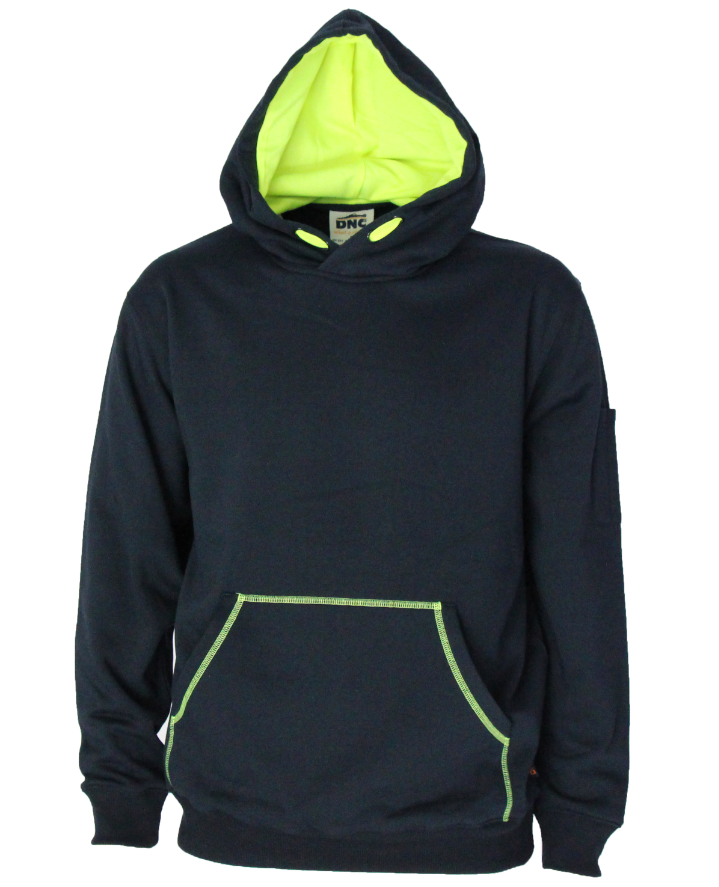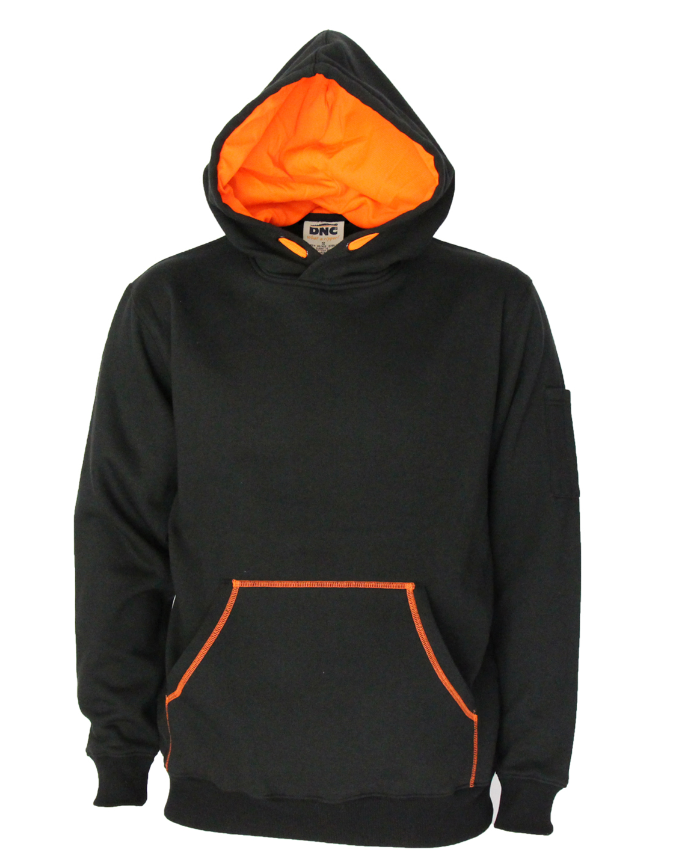 Fabric: 280gsm 65/35% poly/cotton premium quality low pilling brushed fleece, Stylish kangaroo pouch pocket with contrast Hivis stitching, sleeve pen pocket. Safety drawstring stays inside of garment to prevent catching.