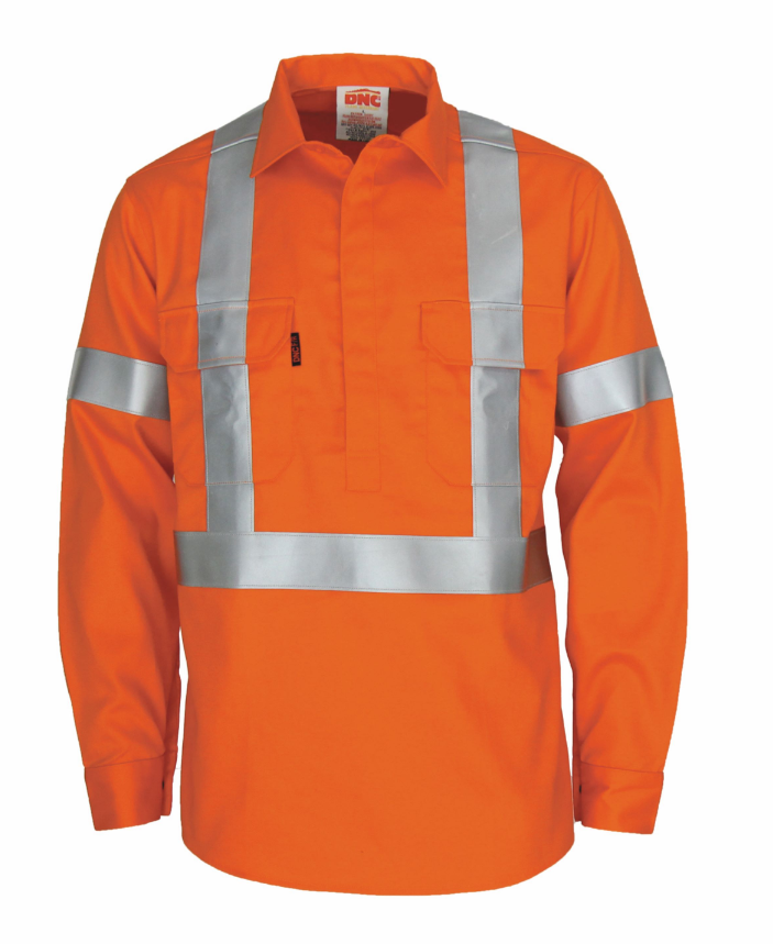 Fabric: 190gsm cotton drill, closed front concealed placket with FR plastic studs closure, Gusset sleeve, comply with BS EN ISO 116612:2008 for FR & NFPA70E(ASTEMF1959/F) for Arc rating - APTV: 6.8Cal/CM2, HRC:1. "X" back with additional tape on back pattern LOXY Sto-nor 9801 FR Reflective tape. L/S. NSW Rail complaint