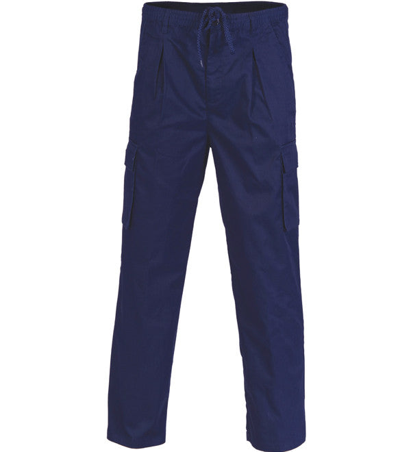 Wash-n-wear, elastic drawstring with belt loops and zip, two large cargo pockets on both lower legs.