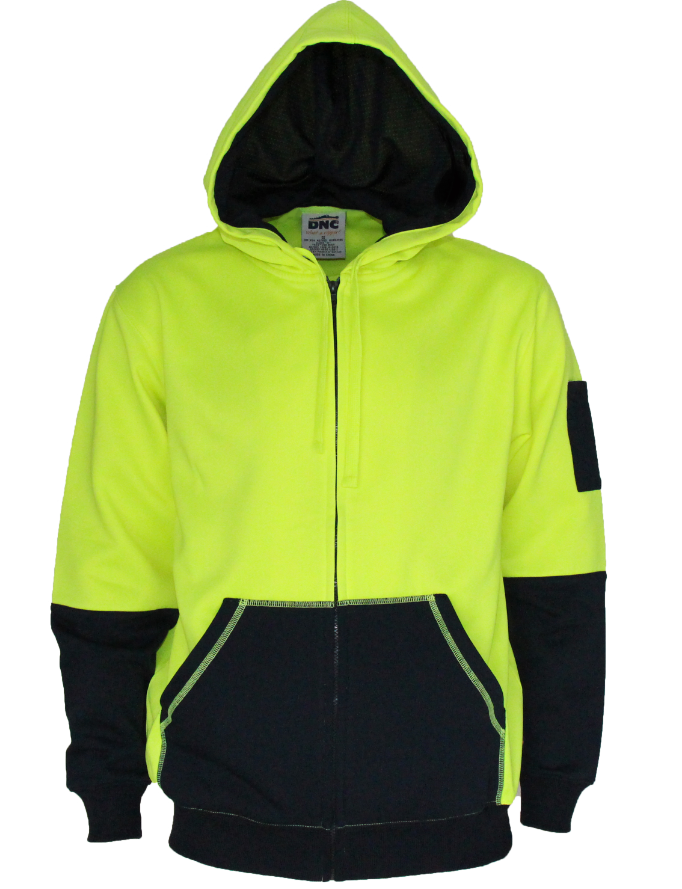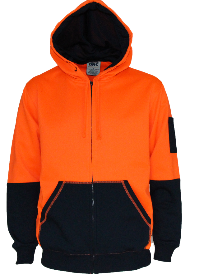 Fabric: 300gsm Hi Vis is 100% polyester. The navy is 65/35% poly/cotton. Premium quality, Full zip front. 2 Front stylish welt pockets with contrast Hivis stitching, navy sleeve pen pocket. safety drawstring stays inside of garment to prevent catching.