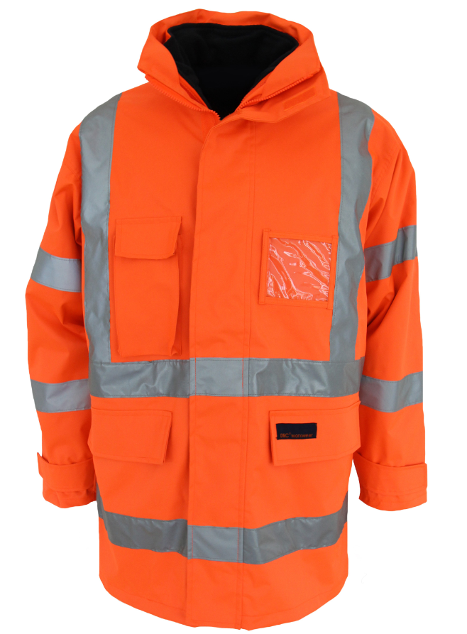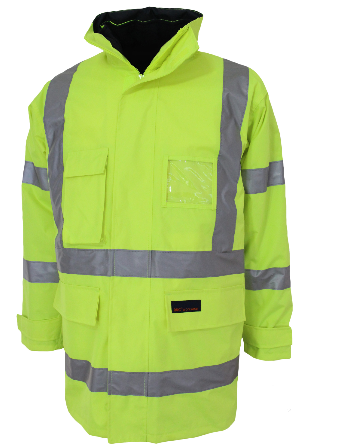 Fabric: 300D Heavy duty polyester/PU. Seam-sealed, waterproof outer shell, 2 flap side pockets, mesh lining, foldaway hood. Storm cuffs with adjustable sleeve tabs. Clear ID & phone pockets, reflective tape front & back. 3/4 Length. "H" pattern on front & back, Biomotion CSR reflective tape on arms. Embroidery access. Hidden access to 3965 zip off jacket, adding the reversible vest converts into "6 in 1" jacket. QLD traffic controller compliant.