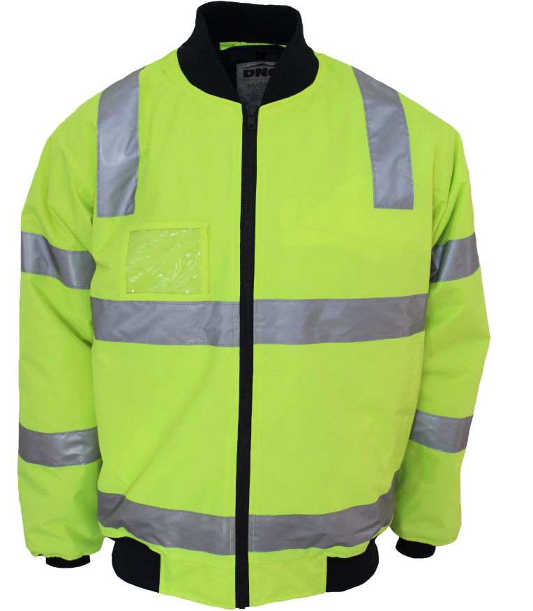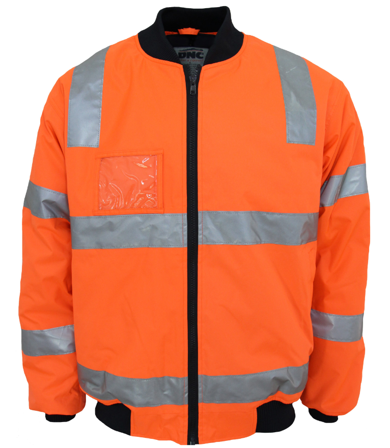 Fabric: 200D polyester/PVC. Seam-sealed, waterproof outer shell, quilt-lined, concealed hood. Clear ID & phone pockets. "Hoop" pattern & 2 shoulder strips, Biomotion CSR reflective tape on arms.