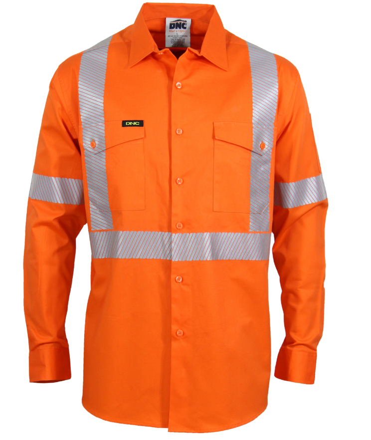 155gsm L/W cotton shirt L/S with under arm & upper back mesh air flow venting, twin button down flap chest pockets, "X" back super lighter weight segmented tape will improve breathability & reduce the heat build up of the reflective tape, also provides better flexibility. Modern & Stylish NSW Rail Compliant.