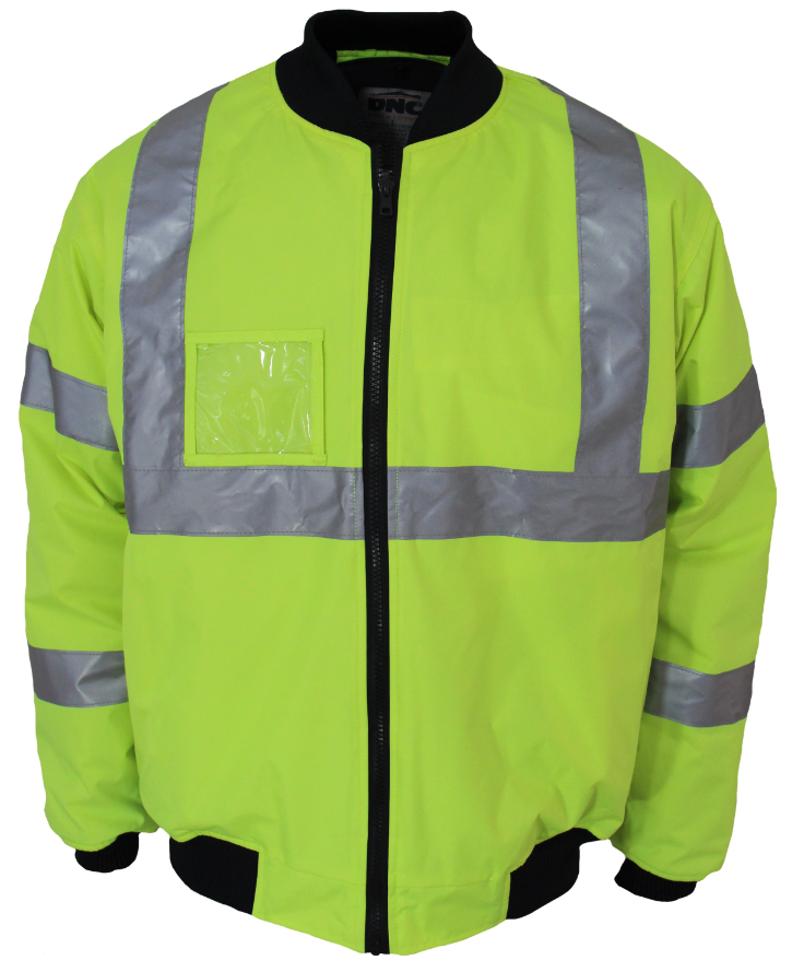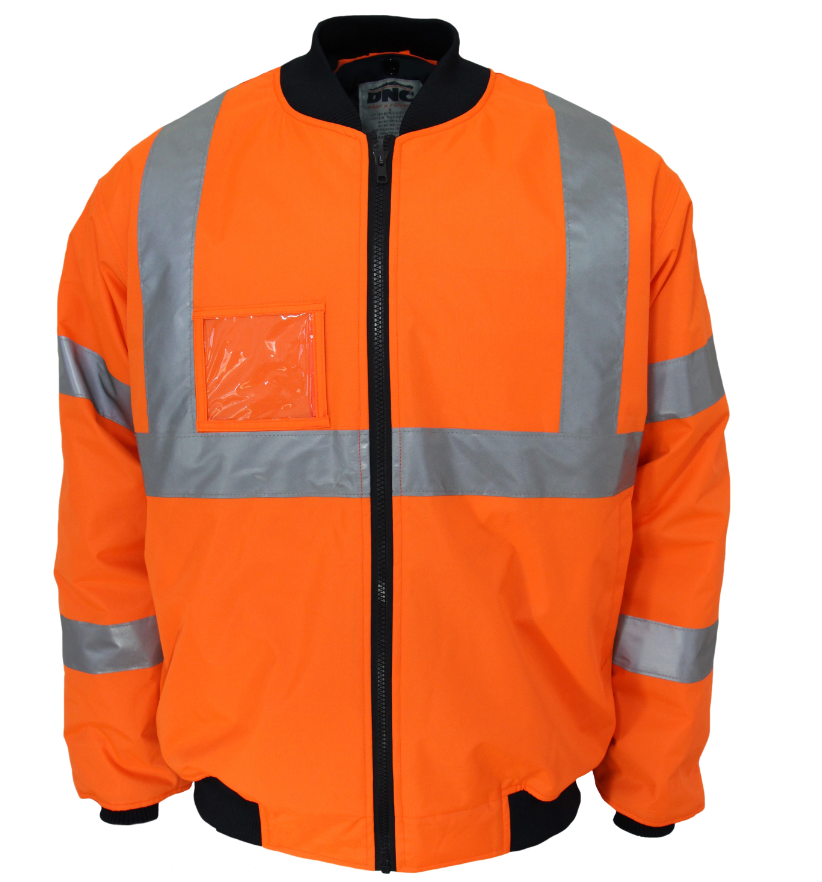 Fabric: 200D polyester/PVC. Seam-sealed, waterproof outer shell, quilt -lined, concealed hood. Clear ID & phone pockets. "H" Pattern front, "X" back & back tail, Biomotion CSR reflective tape on arms. N.S.W rail compliant.